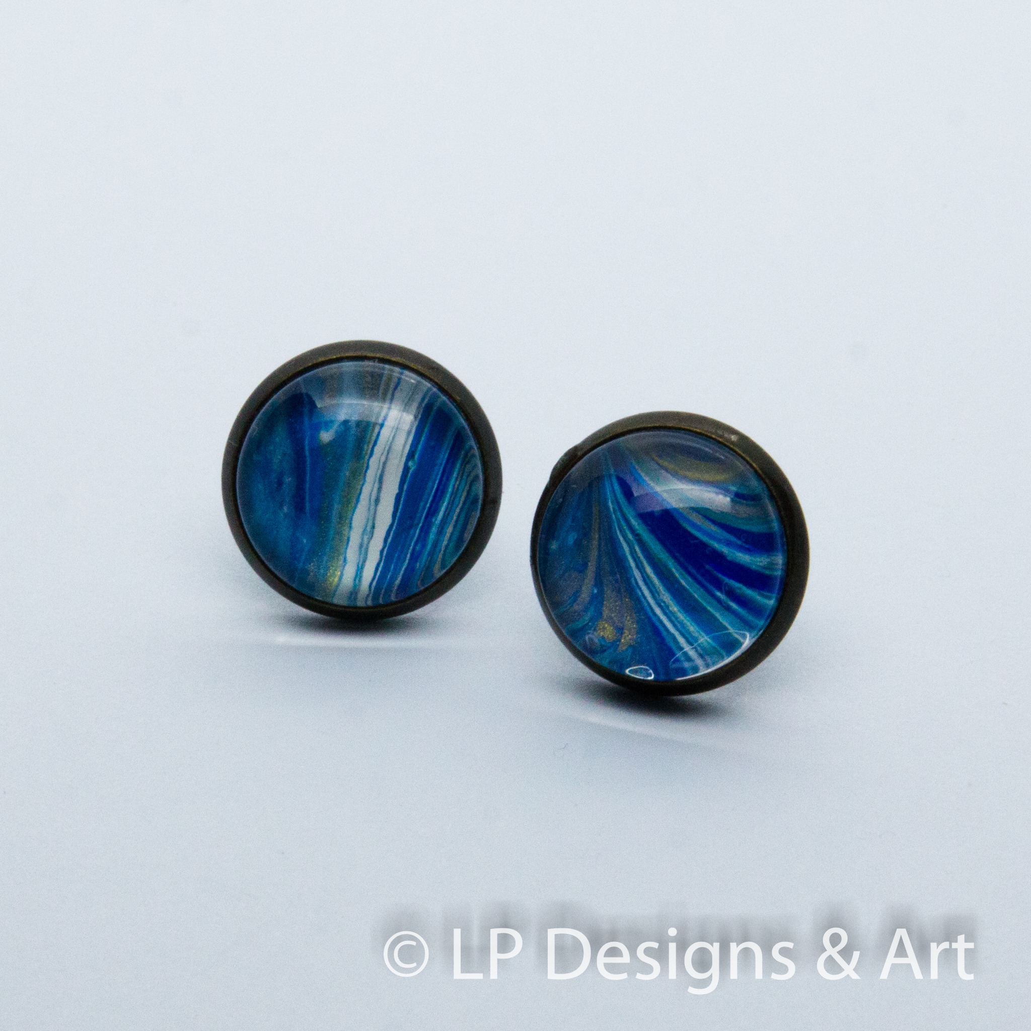 This white, blue and aqua fluid art jewellery comes in antique gold coloured bezels.